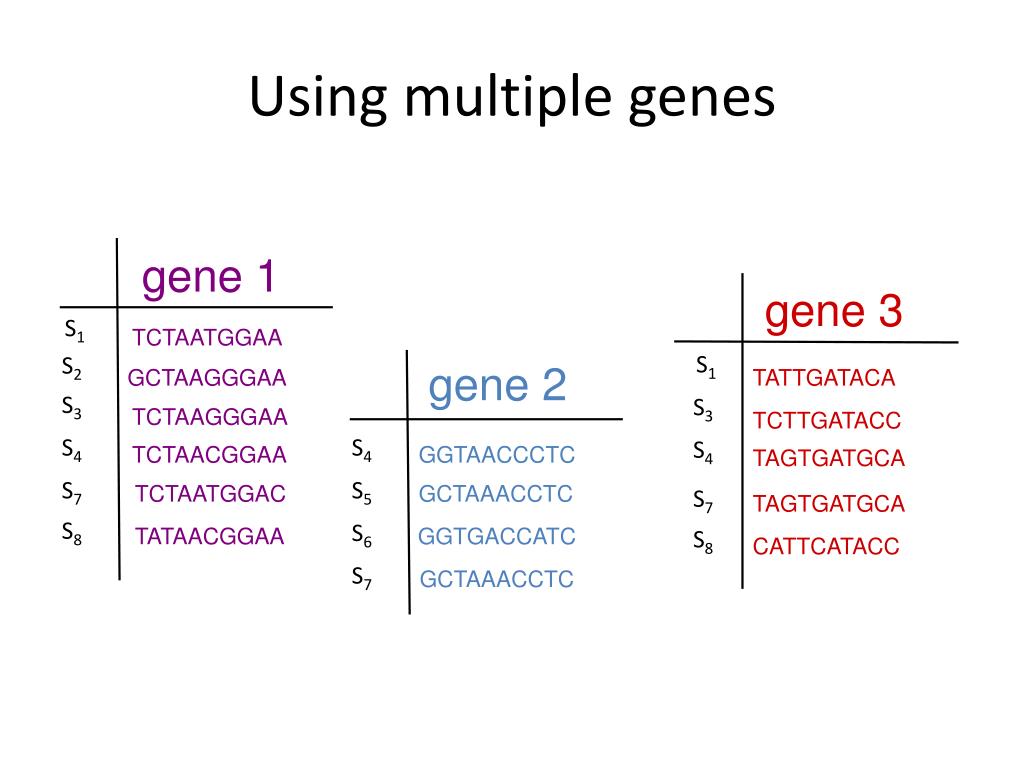 gene 1 gene 3 S1 TCTAATGGAA S1 S2 gene 2 GCTAAGGGAA TATTGATACA S3 S3 TCTAAGGGAA TCTTGATACC S4 S4 S4 TCTAACGGAA GGTAACCCTC TAGTGATGCA S7 S5 TCTAATGGAC GCTAAACCTC S7 TAGTGATGCA S8 S6 TATAACGGAA GGTGACCATC S8 CATTCATACC S7 GCTAAACCTC Using multiple genes