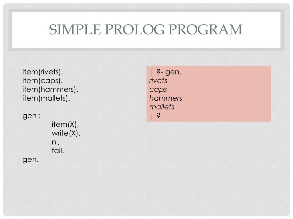 Simple Prolog Program | ?- gen. rivets caps hammers mallets | ?- item(rivets). item(caps). item(hammers). item(mallets). gen :- item(X), write(X), nl, fail. gen.
