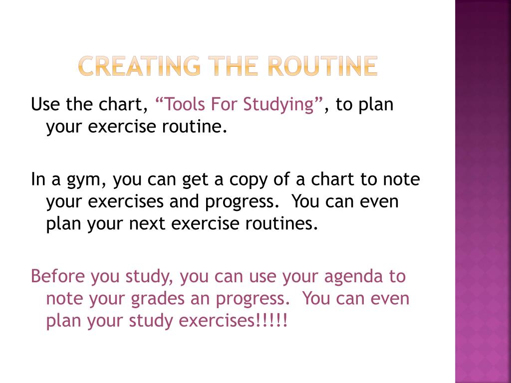 Creating The routine Use the chart, “Tools For Studying”, to plan your exercise routine. In a gym, you can get a copy of a chart to note your exercises and progress. You can even plan your next exercise routines. Before you study, you can use your agenda to note your grades an progress. You can even plan your study exercises!!!!!