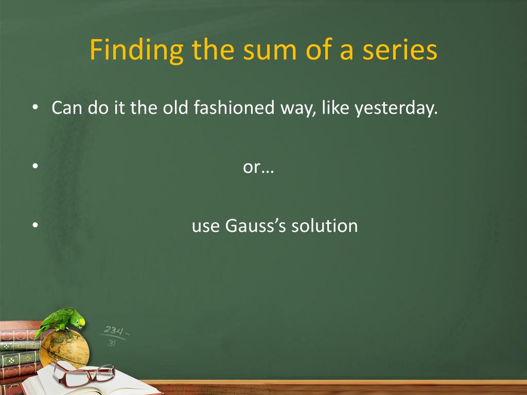 Finding the sum of a series • Can do it the old fashioned way, like yesterday. • or… • use Gauss’s solution