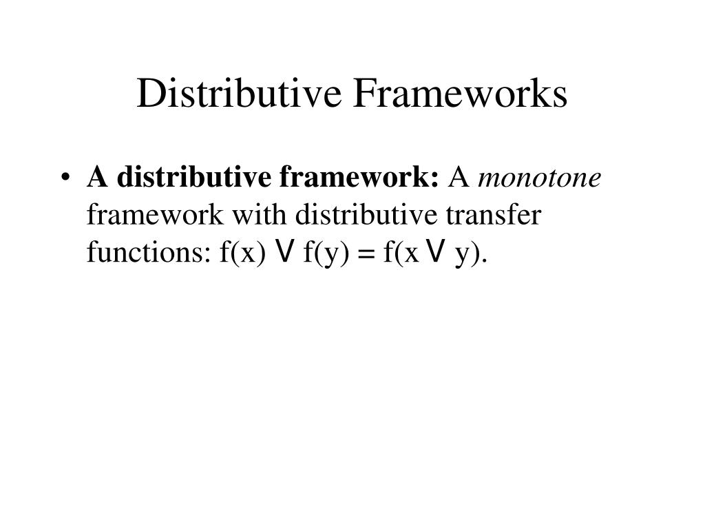Distributive Frameworks • A distributive framework: A monotone framework with distributive transfer functions: f(x)Vf(y) = f(xV y).