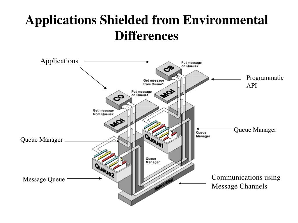 Applications Shielded from Environmental Differences Applications Programmatic API Queue Manager Queue Manager Communications using Message Channels Message Queue