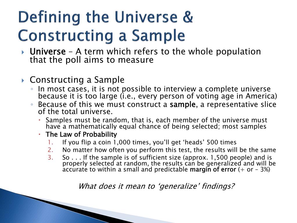 Defining the Universe & Constructing a Sample • Universe – A term which refers to the whole population that the poll aims to measure • Constructing a Sample • In most cases, it is not possible to interview a complete universe because it is too large (i.e., every person of voting age in America) • Because of this we must construct a sample, a representative slice of the total universe. • Samples must be random, that is, each member of the universe must have a mathematically equal chance of being selected; most samples • The Law of Probability • If you flip a coin 1,000 times, you’ll get ‘heads’ 500 times • No matter how often you perform this test, the results will be the same • So . . . If the sample is of sufficient size (approx. 1,500 people) and is properly selected at random, the results can be generalized and will be accurate to within a small and predictable margin of error (+ or – 3%) What does it mean to ‘generalize’ findings?