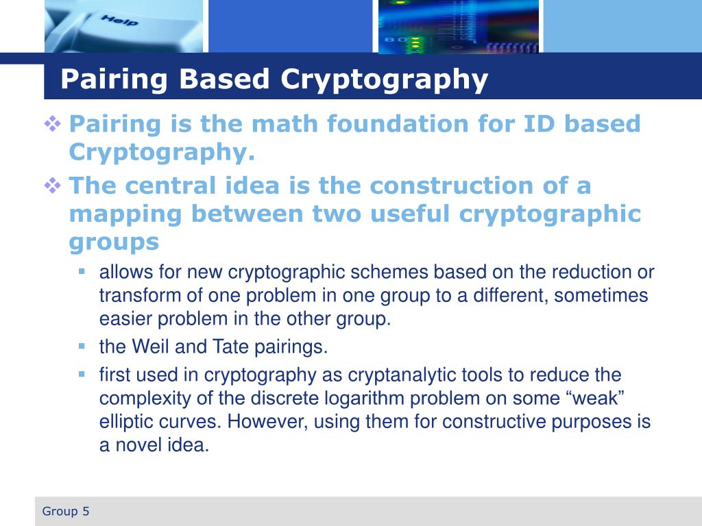 Pairing Based Cryptography • Pairing is the math foundation for ID based Cryptography. • The central idea is the construction of a mapping between two useful cryptographic groups • allows for new cryptographic schemes based on the reduction or transform of one problem in one group to a different, sometimes easier problem in the other group. • the Weil and Tate pairings. • first used in cryptography as cryptanalytic tools to reduce the complexity of the discrete logarithm problem on some “weak” elliptic curves. However, using them for constructive purposes is a novel idea.