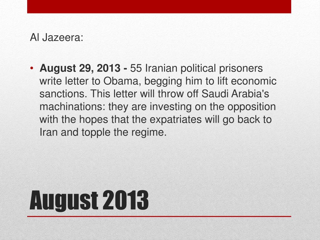 Al Jazeera: • August 29, 2013- 55 Iranian political prisoners write letter to Obama, begging him to lift economic sanctions. This letter will throw off Saudi Arabia's machinations: they are investing on the opposition with the hopes that the expatriates will go back to Iran and topple the regime. August 2013