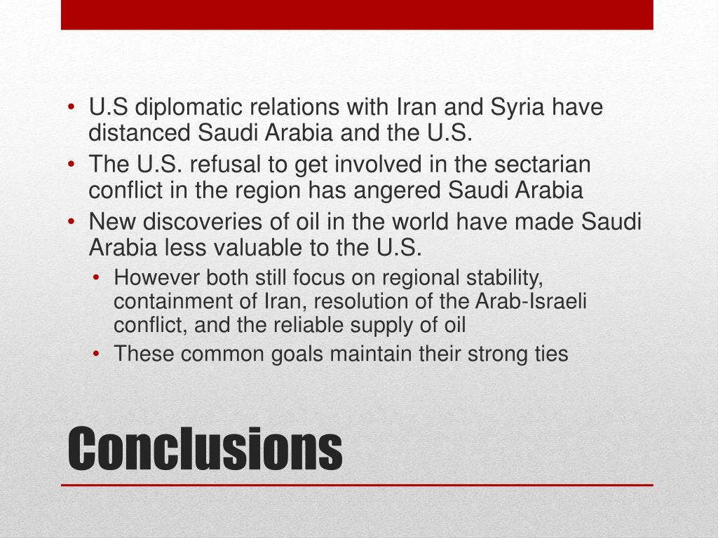 U.S diplomatic relations with Iran and Syria have distanced Saudi Arabia and the U.S. • The U.S. refusal to get involved in the sectarian conflict in the region has angered Saudi Arabia • New discoveries of oil in the world have made Saudi Arabia less valuable to the U.S. • However both still focus on regional stability, containment of Iran, resolution of the Arab-Israeli conflict, and the reliable supply of oil • These common goals maintain their strong ties Conclusions