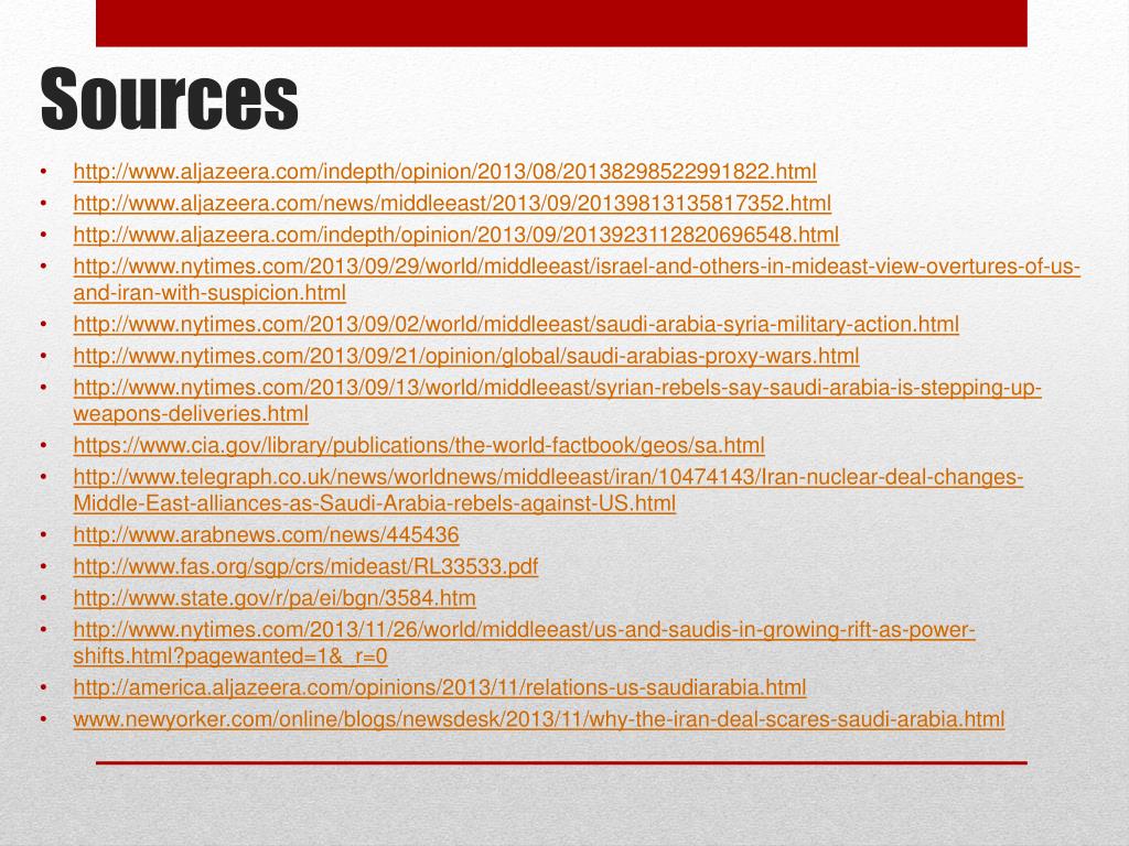 http://www.aljazeera.com/indepth/opinion/2013/08/20138298522991822.htmlhttp://www.aljazeera.com/indepth/opinion/2013/08/20138298522991822.html • http://www.aljazeera.com/news/middleeast/2013/09/20139813135817352.html • http://www.aljazeera.com/indepth/opinion/2013/09/2013923112820696548.html • http://www.nytimes.com/2013/09/29/world/middleeast/israel-and-others-in-mideast-view-overtures-of-us-and-iran-with-suspicion.html • http://www.nytimes.com/2013/09/02/world/middleeast/saudi-arabia-syria-military-action.html • http://www.nytimes.com/2013/09/21/opinion/global/saudi-arabias-proxy-wars.html • http://www.nytimes.com/2013/09/13/world/middleeast/syrian-rebels-say-saudi-arabia-is-stepping-up-weapons-deliveries.html • https://www.cia.gov/library/publications/the-world-factbook/geos/sa.html • http://www.telegraph.co.uk/news/worldnews/middleeast/iran/10474143/Iran-nuclear-deal-changes-Middle-East-alliances-as-Saudi-Arabia-rebels-against-US.html • http://www.arabnews.com/news/445436 • http://www.fas.org/sgp/crs/mideast/RL33533.pdf • http://www.state.gov/r/pa/ei/bgn/3584.htm • http://www.nytimes.com/2013/11/26/world/middleeast/us-and-saudis-in-growing-rift-as-power-shifts.html?pagewanted=1&_r=0 • http://america.aljazeera.com/opinions/2013/11/relations-us-saudiarabia.html • www.newyorker.com/online/blogs/newsdesk/2013/11/why-the-iran-deal-scares-saudi-arabia.html Sources