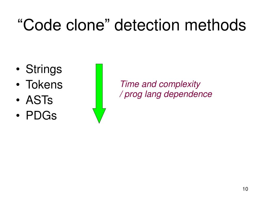 “Code clone” detection methods • Strings • Tokens • ASTs • PDGs Time and complexity / proglang dependence
