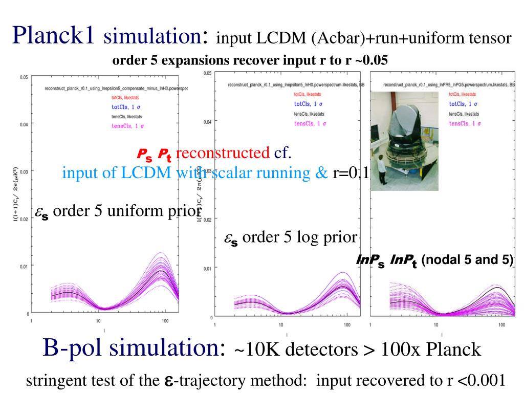Planck1 simulation:input LCDM (Acbar)+run+uniform tensor order 5 expansions recover input r to r ~0.05 PsPtreconstructed cf. input of LCDM with scalar running & r=0.1 esorder 5 uniform prior esorder 5 log prior lnPslnPt(nodal 5 and 5) B-pol simulation:~10K detectors > 100x Planck stringent test of the e-trajectory method: input recovered to r <0.001