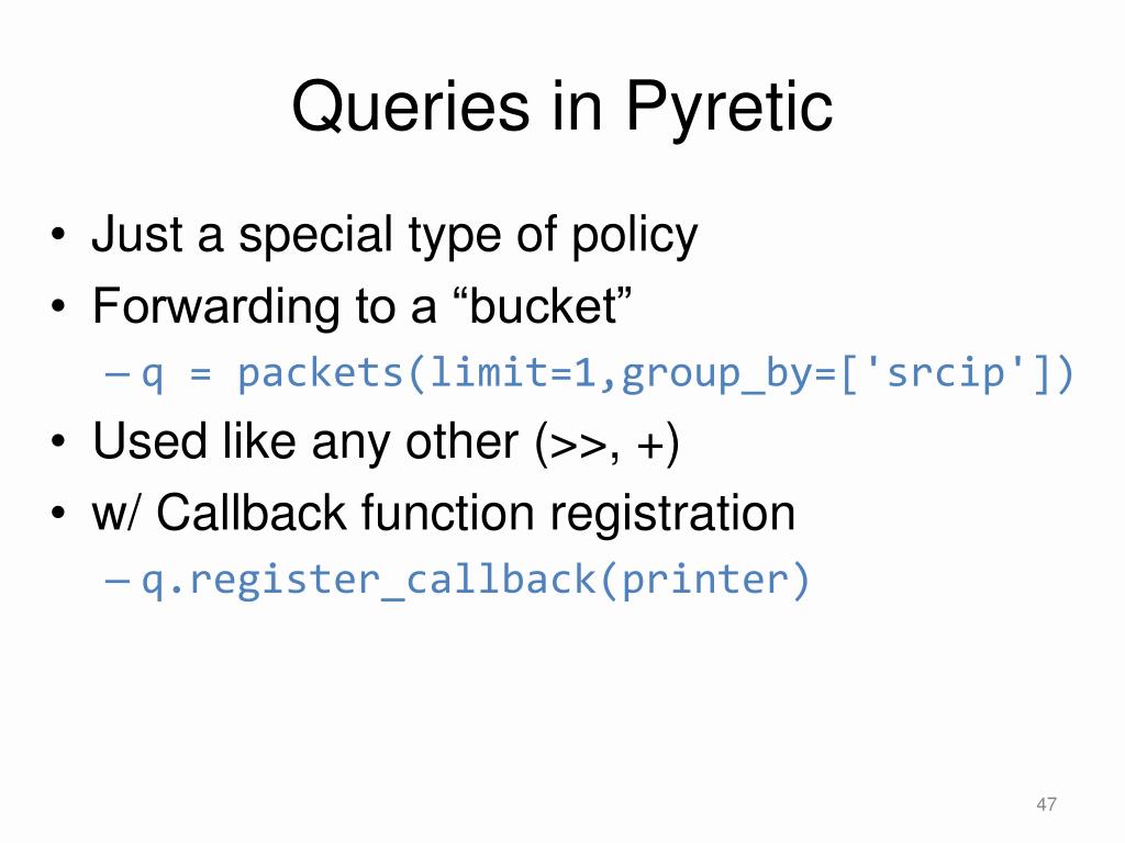 Queries in Pyretic • Just a special type of policy • Forwarding to a “bucket” • q= packets(limit=1,group_by=['srcip']) • Used like any other (>>, +) • w/ Callback function registration • q.register_callback(printer)