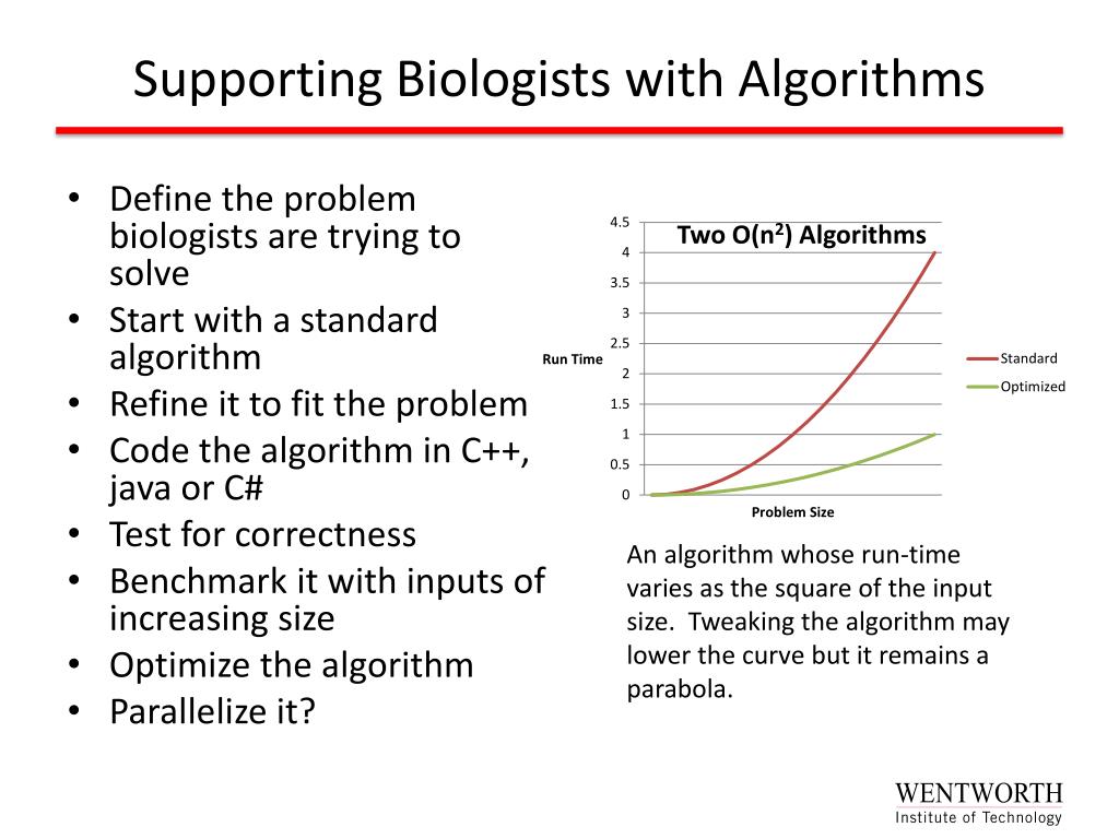 Supporting Biologists with Algorithms • Define the problem biologists are trying to solve • Start with a standard algorithm • Refine it to fit the problem • Code the algorithm in C++, java or C# • Test for correctness • Benchmark it with inputs of increasing size • Optimize the algorithm • Parallelize it? An algorithm whose run-time varies as the square of the input size. Tweaking the algorithm may lower the curve but it remains a parabola.