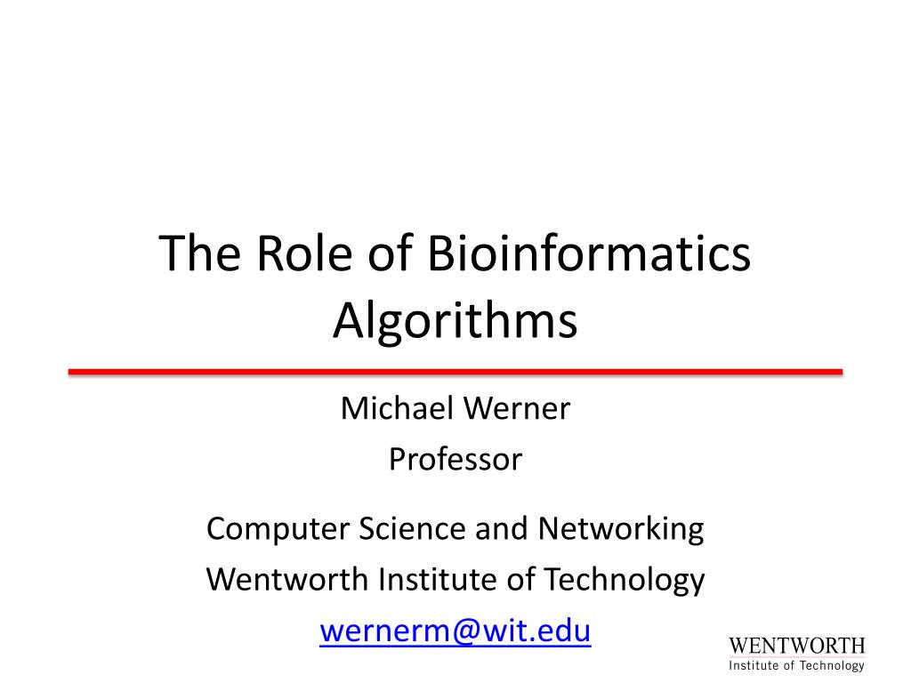 The Role of Bioinformatics Algorithms Michael Werner Professor Computer Science and Networking Wentworth Institute of Technology wernerm@wit.edu