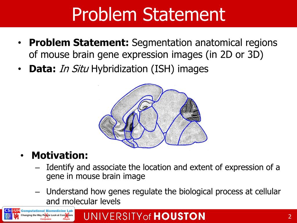 Automatic Multi-Region Segmentation Applied to Gene Expression Image from Mouse Brain. Yen Le Computation Biomedicine Lab Advisor: Dr. Kakadiaris. Problem Statement. Problem Statement: Segmentation anatomical regions of mouse brain gene expression images (in 2D or 3D)