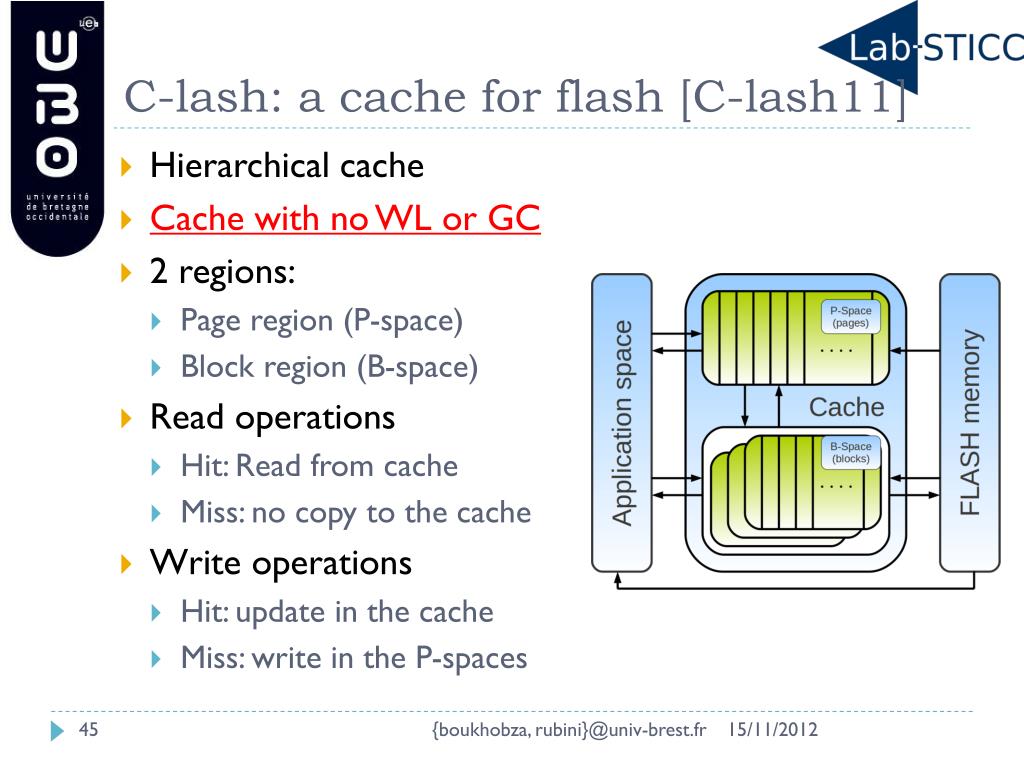 C-lash: a cache for flash [C-lash11] • Hierarchical cache • Cache with no WL or GC • 2 regions: • Page region (P-space) • Block region (B-space) • Read operations • Hit: Read from cache • Miss: no copy to the cache • Write operations • Hit: update in the cache • Miss: write in the P-spaces {boukhobza, rubini}@univ-brest.fr