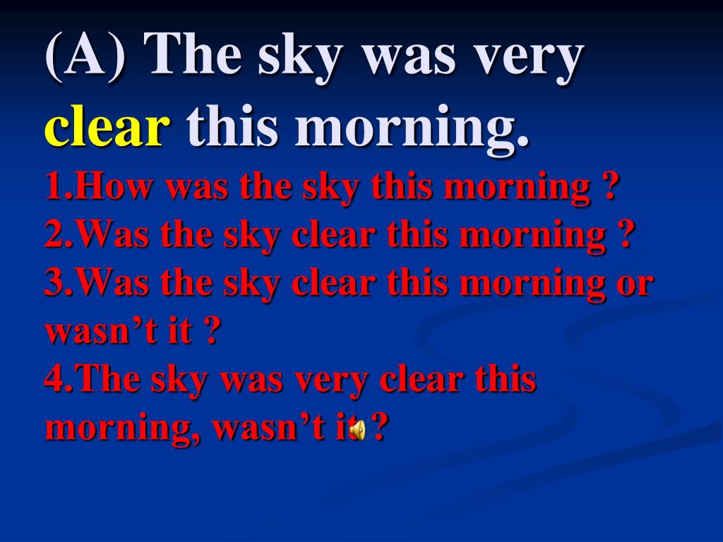 (A) The sky was very clear this morning.1.How was the sky this morning ?2.Was the sky clear this morning ?3.Was the sky clear this morning or wasn’t it ?4.The sky was very clear this morning, wasn’t it ?