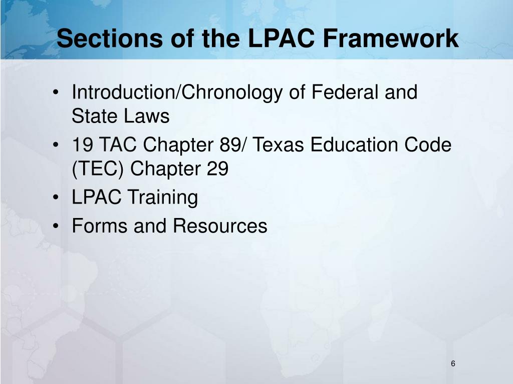 Sections of the LPAC Framework Introduction/Chronology of Federal and State Laws 19 TAC Chapter 89/ Texas Education Code (TEC) Chapter 29 LPAC Training Forms and Resources