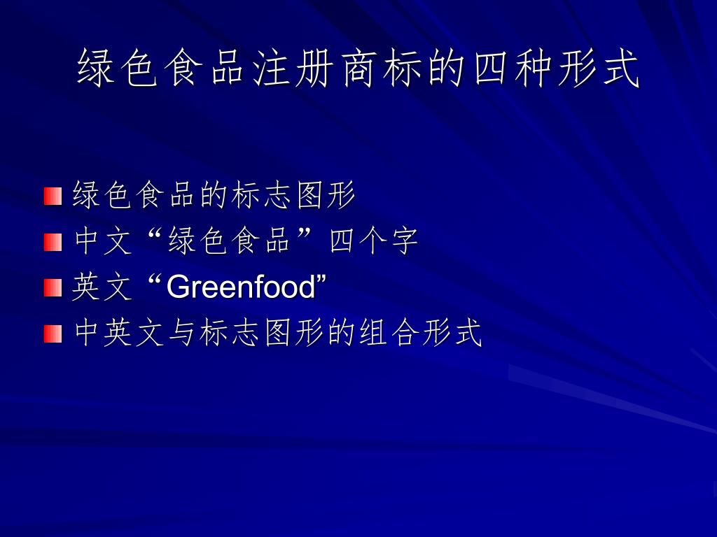 绿色食品注册商标的四种形式 • 绿色食品的标志图形 • 中文“绿色食品”四个字 • 英文“Greenfood” • 中英文与标志图形的组合形式
