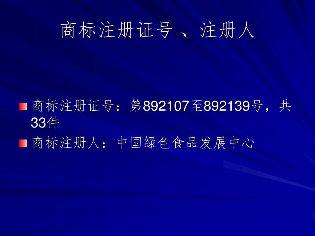 商标注册证号 、注册人 • 商标注册证号:第892107至892139号,共33件 • 商标注册人:中国绿色食品发展中心