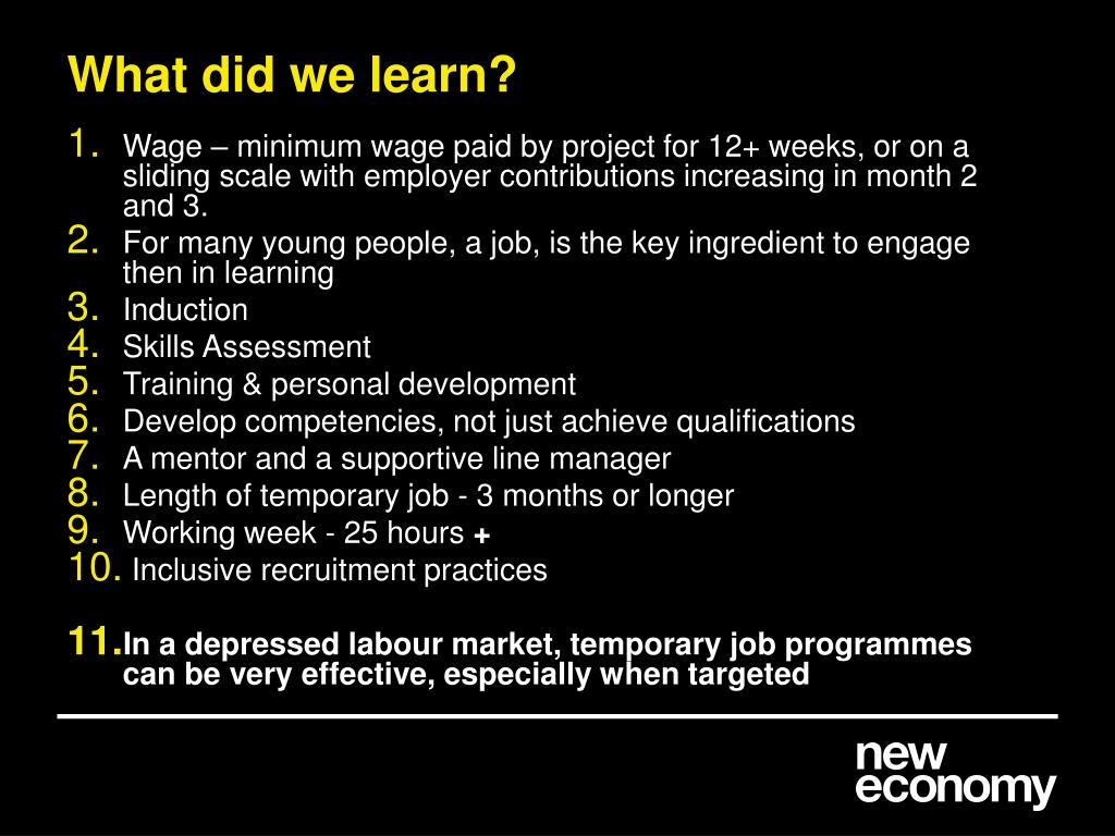 What did we learn? • Wage – minimum wage paid by project for 12+ weeks, or on a sliding scale with employer contributions increasing in month 2 and 3. • For many young people, a job, is the key ingredient to engage then in learning • Induction • Skills Assessment • Training & personal development • Develop competencies, not just achieve qualifications • A mentor and a supportive line manager • Length of temporary job - 3 months or longer • Working week - 25 hours + • Inclusive recruitment practices • In a depressed labour market, temporary job programmes can be very effective, especially when targeted