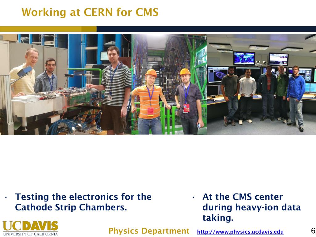 Research at Davis and Beyond Research conducted on Campus, but through international collaborations. At Davis: • Condensed Matter Experiment, Theoretical research, Complexity, Detector development. International collaborations: • Collider experiments (High-Energy/Nuclear) • CMS at the LHC, CERN • STAR at RHIC, Brookhaven Natl. Lab • Neutrino and Dark Matter • LUX, South Dakota • Double Chooz, France • Cosmology • LSST, at Chile • Keck telescope, Hawaii