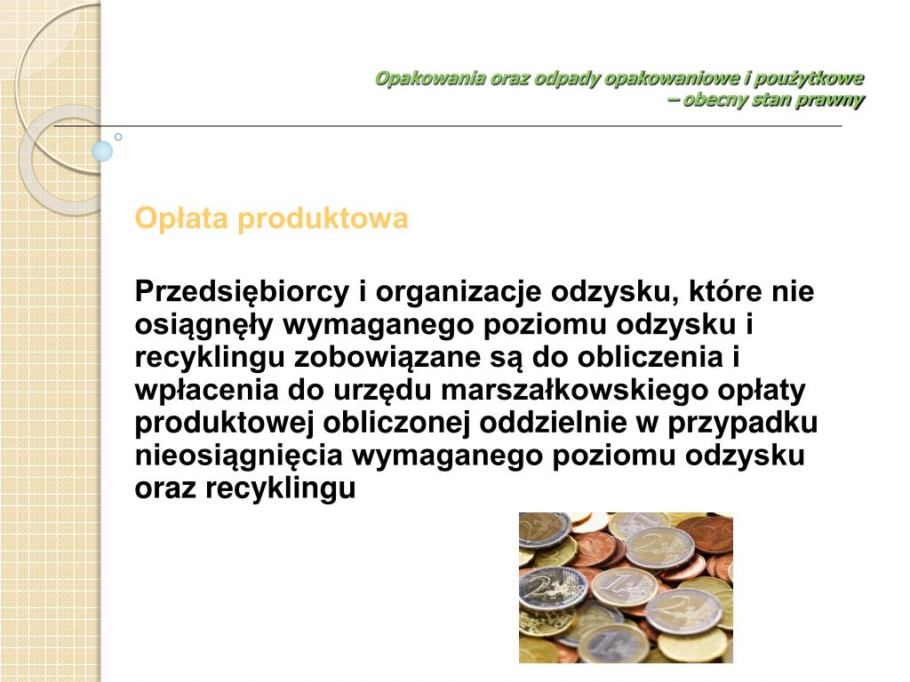 Opłata produktowa Przedsiębiorcy i organizacje odzysku, które nie osiągnęły wymaganego poziomu odzysku i recyklingu zobowiązane są do obliczenia i wpłacenia do urzędu marszałkowskiego opłaty produktowej obliczonej oddzielnie w przypadku nieosiągnięcia wymaganego poziomu odzysku oraz recyklingu Opakowania oraz odpady opakowaniowe i poużytkowe – obecny stan prawny