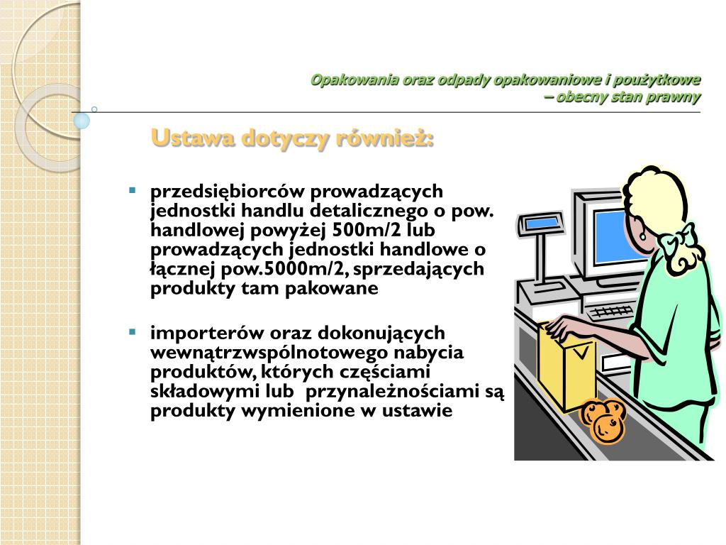 Opakowania oraz odpady opakowaniowe i poużytkowe – obecny stan prawny do przedsiębiorców w rozumieniu przepisów ustawy z dnia 2 lipca 2004 r. o swobodzie działalności gospodarczej (Dz. U. Nr 173, poz. 1087), wprowadzających na terytorium kraju produkty w opakowaniach, których rodzaje określa załącznik nr 1 do ustawy, i produkty wymienione w załącznikach nr 2 i 3 do ustawy oraz określa zasady ustalania i pobierania opłaty produktowej i opłaty depozytowej Przepisy ustawy o obowiązkach przedsiębiorców w zakresie gospodarowania niektórymi odpadami oraz o opłacie produktowej stosuje się…