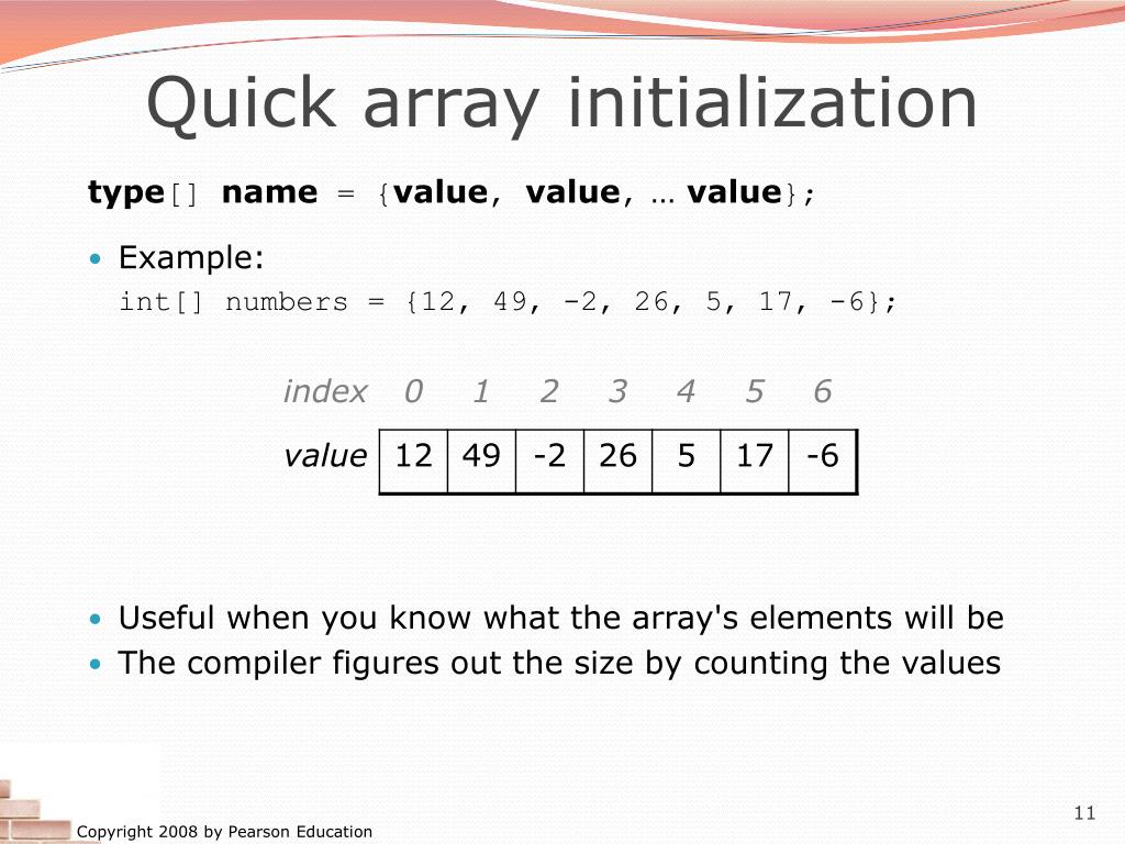 Quick array initialization type[] name = {value, value, … value}; Example: int[] numbers = {12, 49, -2, 26, 5, 17, -6}; Useful when you know what the array's elements will be The compiler figures out the size by counting the values