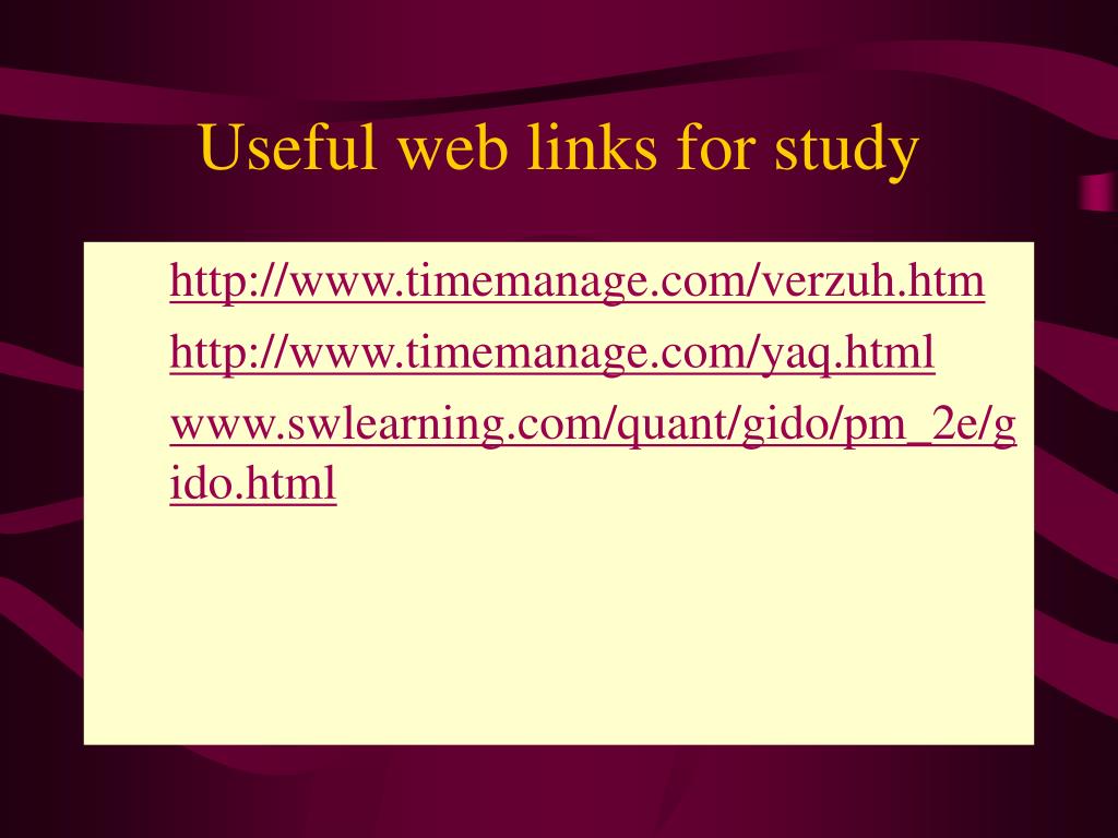 Useful web links for study • http://www.timemanage.com/verzuh.htm • http://www.timemanage.com/yaq.html • www.swlearning.com/quant/gido/pm_2e/gido.html • http://