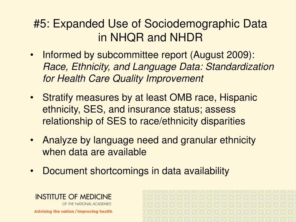 #5: Expanded Use of Sociodemographic Data in NHQR and NHDR • Informed by subcommittee report (August 2009): Race, Ethnicity, and Language Data: Standardization for Health Care Quality Improvement • Stratify measures by at least OMB race, Hispanic ethnicity, SES, and insurance status; assess relationship of SES to race/ethnicity disparities • Analyze by language need and granular ethnicity when data are available • Document shortcomings in data availability