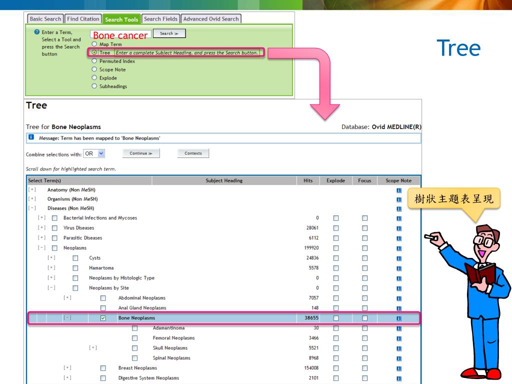 Search Tools • Map Term:主題比對;等同於Advanced Ovid Search之Map Term to Subject Heading。 • Tree:顯示以樹狀構造排列之主題表;標準控制詞彙以具階級架構的樹狀圖排列,讀者可以了解輸入之關鍵字或片語可對應的主題所在位置以及了解相關父階層或子階層的主題。 • Thesaurus:顯示以字順排列之主題表;標準控制詞彙以字順方式排列,讀者可以了解輸入之關鍵字或片語可對應的主題,並且顯示相關Broader Term、Narrow Term、Related Term和Used-for Terms。 • Permuted Index:替代索引;藉由輸入單一關鍵字顯示所有包含此關鍵字的主題、Related terms和Used-for terms等。 • Scope Note:名詞解釋;提供該標準主題詞彙的參考資料。 • Explode:延展主題查詢;延展搜尋結果,包含該主題以及子階層之主題。 • Subheadings:副標題查詢;查詢並顯示標準主題詞彙的副標題。 • Classification Codes:分類號查詢;部分資料庫提供分類號及主題供查詢。