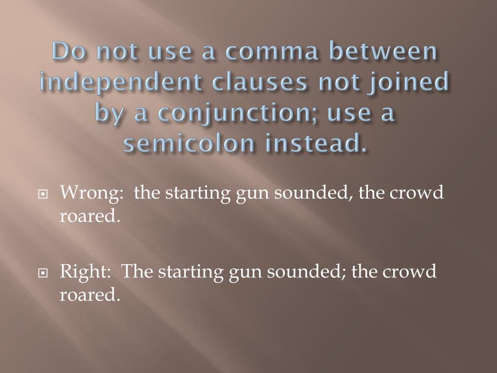 Do not use a comma between independent clauses not joined by a conjunction; use a semicolon instead. • Wrong: the starting gun sounded, the crowd roared. • Right: The starting gun sounded; the crowd roared.