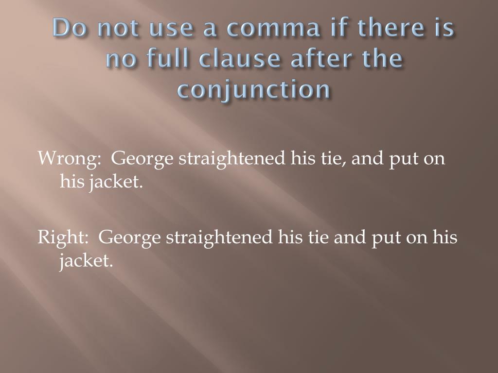 Do not use a comma if there is no full clause after the conjunction Wrong: George straightened his tie, and put on his jacket. Right: George straightened his tie and put on his jacket.