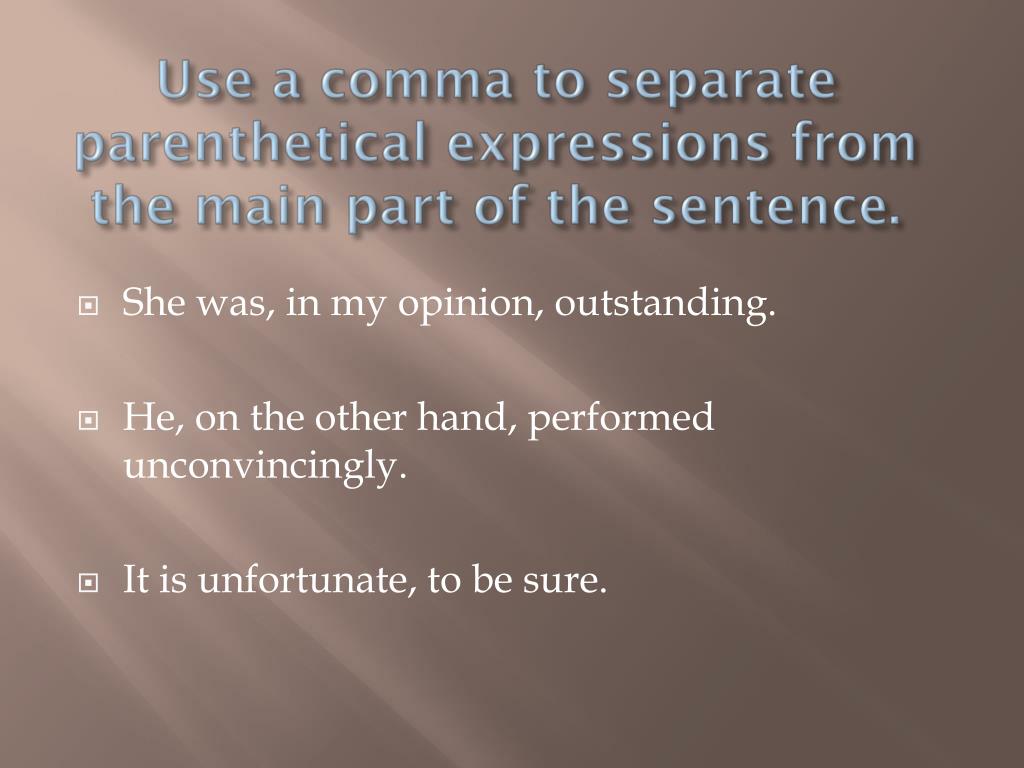 Use a comma to separate parenthetical expressions from the main part of the sentence. • She was, in my opinion, outstanding. • He, on the other hand, performed unconvincingly. • It is unfortunate, to be sure.