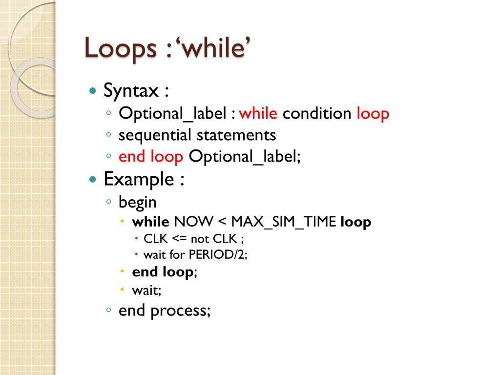 Loops : ‘while’ • Syntax : • Optional_label : whilecondition loop • sequential statements • end loop Optional_label; • Example : • begin • whileNOW < MAX_SIM_TIME loop • CLK <= not CLK ; • wait for PERIOD/2; • end loop; • wait; • end process;