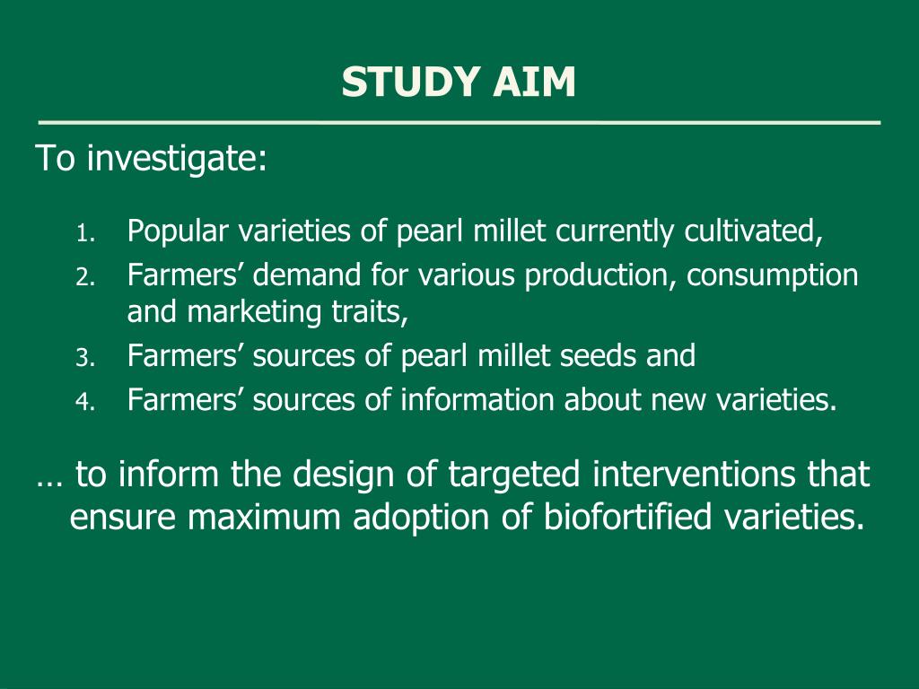 STUDY AIM To investigate: • Popular varieties of pearl millet currently cultivated, • Farmers’ demand for various production, consumption and marketing traits, • Farmers’ sources of pearl millet seeds and • Farmers’ sources of information about new varieties. … to inform the design of targeted interventions that ensure maximum adoption of biofortified varieties.