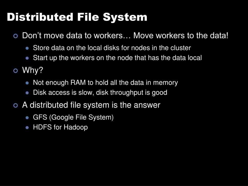 Distributed File System • Don’t move data to workers… Move workers to the data! • Store data on the local disks for nodes in the cluster • Start up the workers on the node that has the data local • Why? • Not enough RAM to hold all the data in memory • Disk access is slow, disk throughput is good • A distributed file system is the answer • GFS (Google File System) • HDFS for Hadoop