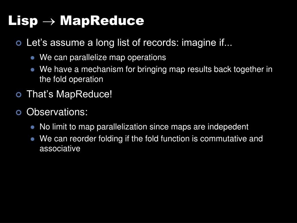 Lisp MapReduce • Let’s assume a long list of records: imagine if... • We can parallelize map operations • We have a mechanism for bringing map results back together in the fold operation • That’s MapReduce! • Observations: • No limit to map parallelization since maps are indepedent • We can reorder folding if the fold function is commutative and associative