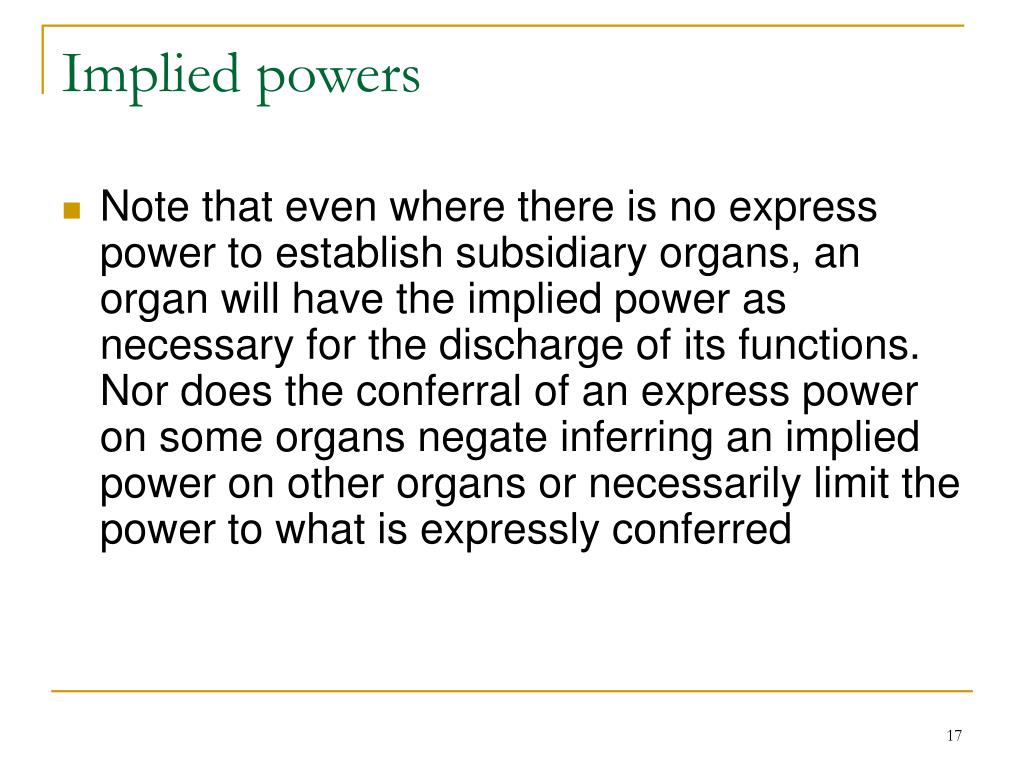 Implied powers • Note that even where there is no express power to establish subsidiary organs, an organ will have the implied power as necessary for the discharge of its functions. Nor does the conferral of an express power on some organs negate inferring an implied power on other organs or necessarily limit the power to what is expressly conferred