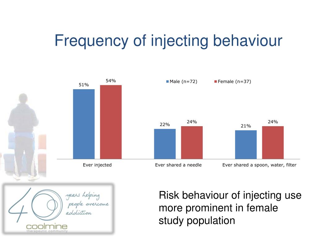 Frequency of injecting behaviour Risk behaviour of injecting use more prominent in female study population