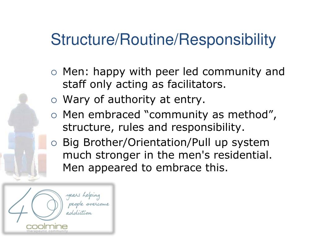Structure/Routine/Responsibility Men: happy with peer led community and staff only acting as facilitators. Wary of authority at entry. Men embraced “community as method”, structure, rules and responsibility. Big Brother/Orientation/Pull up system much stronger in the men's residential. Men appeared to embrace this.