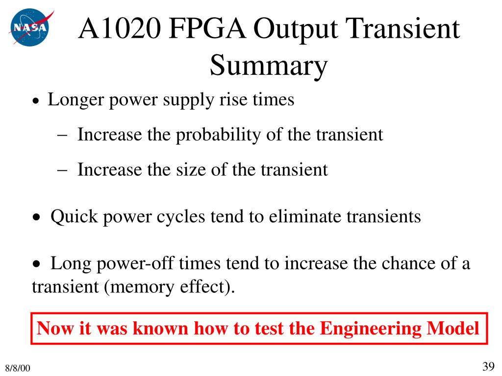 A1020 FPGA Output Transient Summary • Longer power supply rise times • Increase the probability of the transient • Increase the size of the transient • Quick power cycles tend to eliminate transients • Long power-off times tend to increase the chance of a transient (memory effect). Now it was known how to test the Engineering Model