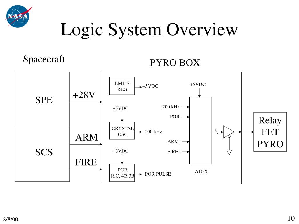 PYRO BOX LM117 REG +5VDC +5VDC +28V SPE 200 kHz +5VDC POR Relay FET PYRO CRYSTAL OSC 200 kHz ARM ARM SCS +5VDC FIRE FIRE POR R,C, 4093B A1020 POR PULSE Logic System Overview Spacecraft