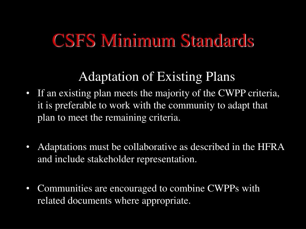 Adaptation of Existing Plans If an existing plan meets the majority of the CWPP criteria, it is preferable to work with the community to adapt that plan to meet the remaining criteria. Adaptations must be collaborative as described in the HFRA and include stakeholder representation. Communities are encouraged to combine CWPPs with related documents where appropriate. CSFS Minimum Standards