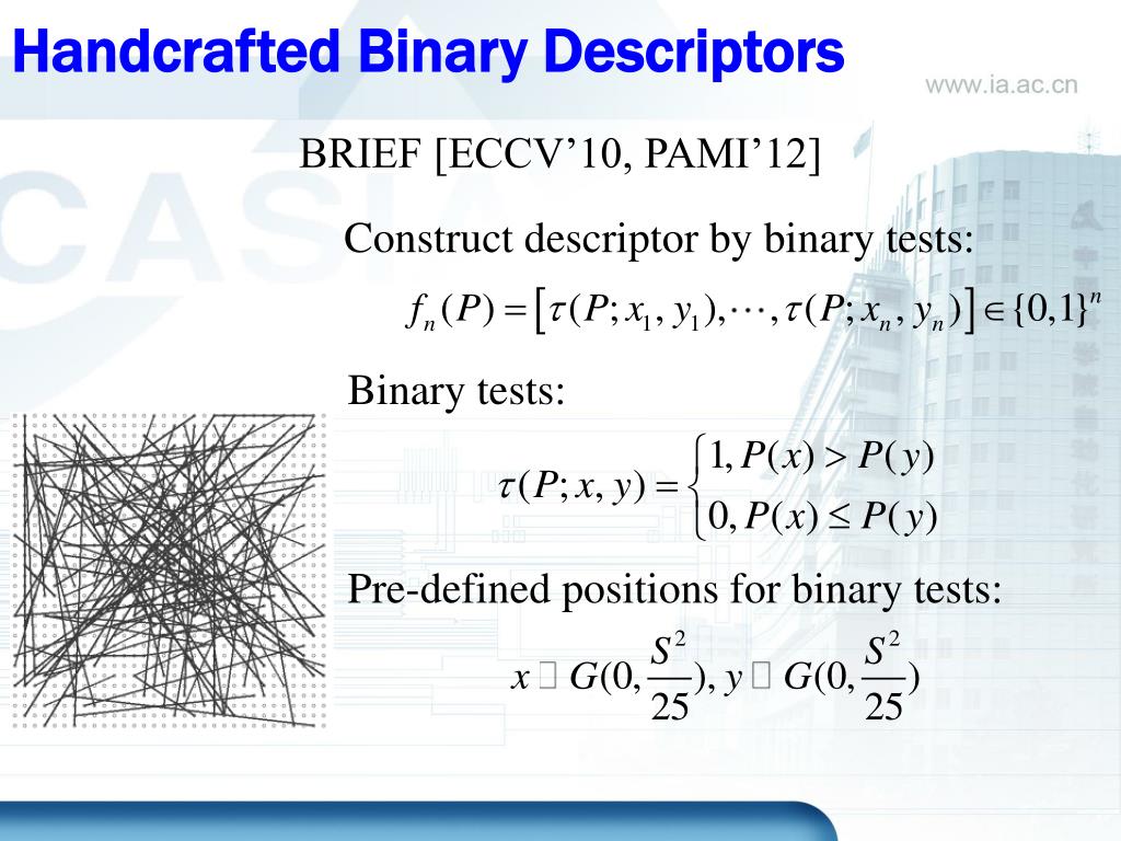 Handcrafted Binary Descriptors BRIEF [ECCV’10, PAMI’12] Construct descriptor by binary tests: Binary tests: Pre-defined positions for binary tests: