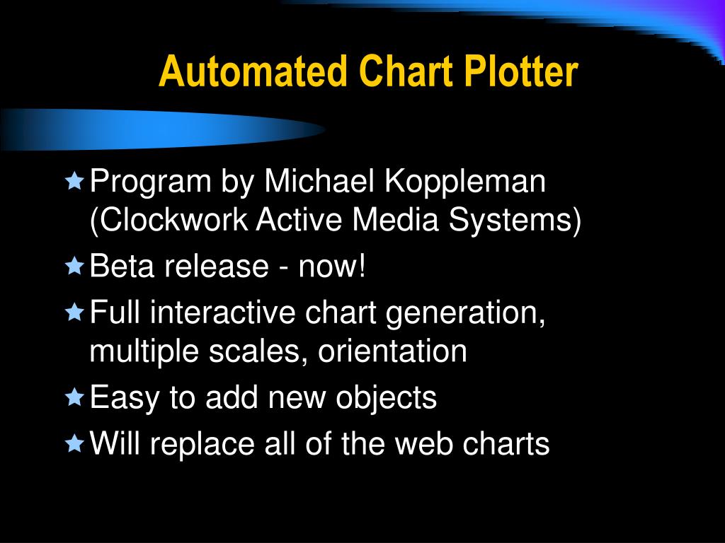 Automated Chart Plotter • Program by Michael Koppleman (Clockwork Active Media Systems) • Beta release - now! • Full interactive chart generation, multiple scales, orientation • Easy to add new objects • Will replace all of the web charts