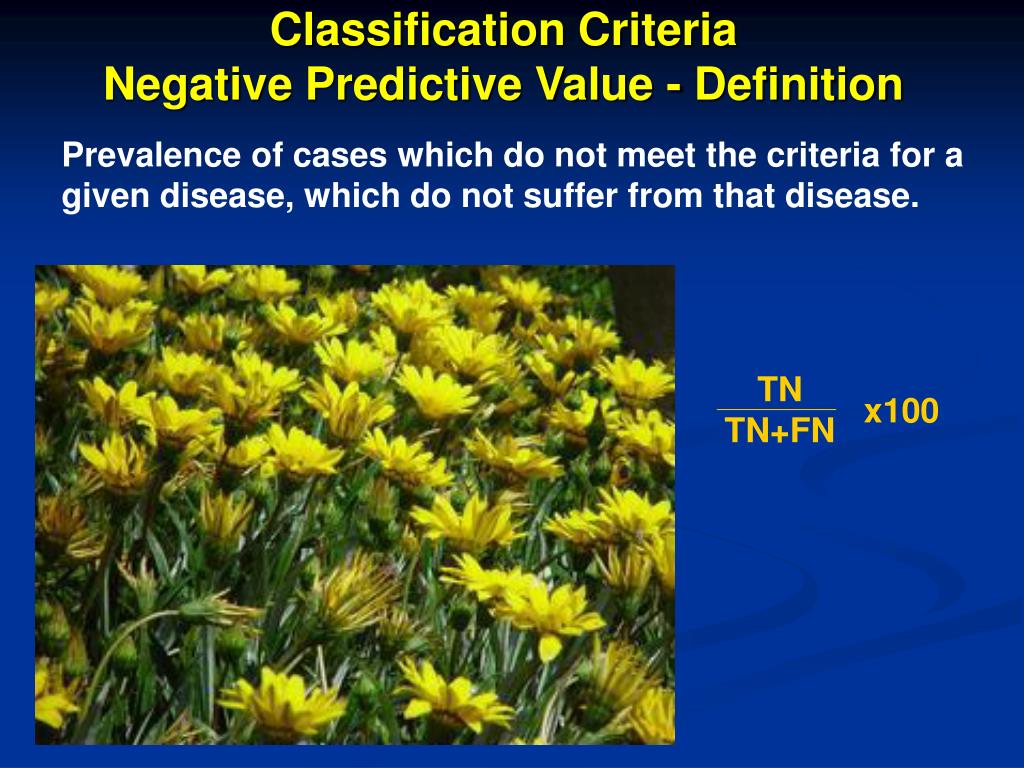Classification CriteriaNegative Predictive Value - Definition Prevalence of cases which do not meet the criteria for a given disease, which do not suffer from that disease. TN TN+FN x100