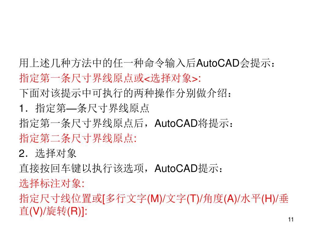 执行完成任意一个选项后,AutoCAD都会回到以下提示中:执行完成任意一个选项后,AutoCAD都会回到以下提示中: 指定尺寸线位置或[多行文字(M)/文字(T)/角度(A)/水平(H)/垂直(V)/旋转(R)]: 在该提示下指定尺寸线的位置,则AutoCAD就会按自动测量出的两尺寸界线间的相应距离标出尺寸。 此提示行中各选项的含义与前面所介绍的同名项的含义相同。