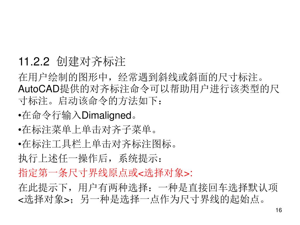 11.2.2 创建对齐标注 在用户绘制的图形中,经常遇到斜线或斜面的尺寸标注。AutoCAD提供的对齐标注命令可以帮助用户进行该类型的尺寸标注。启动该命令的方法如下: • 在命令行输入Dimaligned。 • 在标注菜单上单击对齐子菜单。 • 在标注工具栏上单击对齐标注图标。 执行上述任一操作后,系统提示: 指定第一条尺寸界线原点或<选择对象>: 在此提示下,用户有两种选择:一种是直接回车选择默认项<选择对象>;另一种是选择一点作为尺寸界线的起始点。