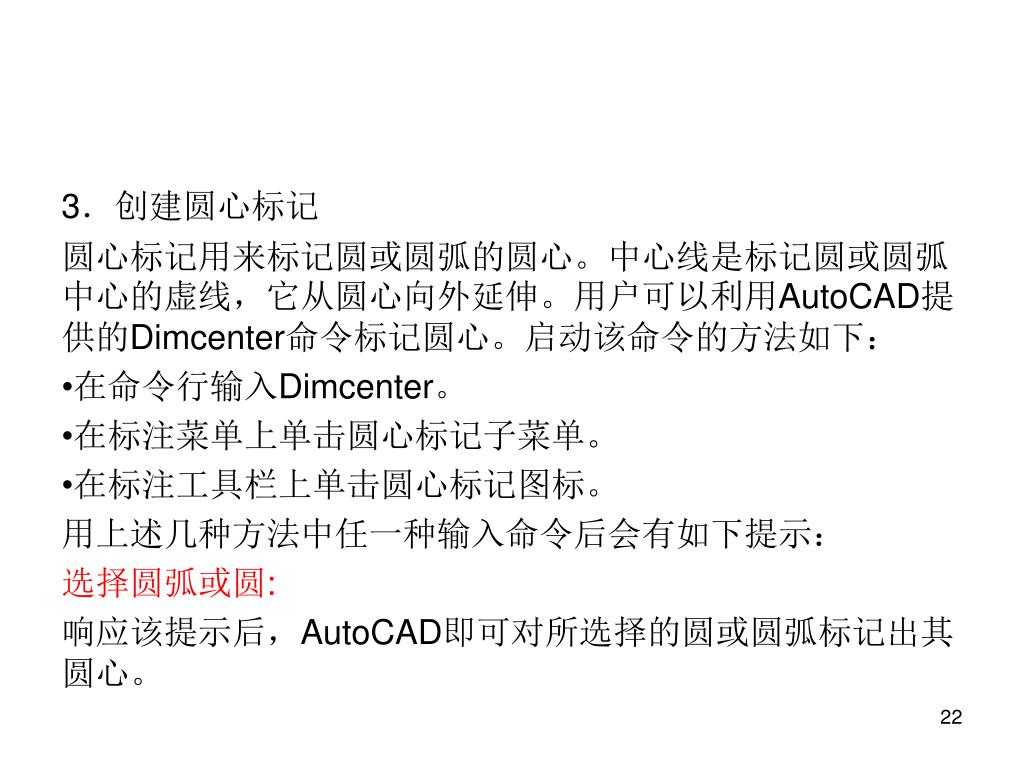 3.创建圆心标记 圆心标记用来标记圆或圆弧的圆心。中心线是标记圆或圆弧中心的虚线,它从圆心向外延伸。用户可以利用AutoCAD提供的Dimcenter命令标记圆心。启动该命令的方法如下: • 在命令行输入Dimcenter。 • 在标注菜单上单击圆心标记子菜单。 • 在标注工具栏上单击圆心标记图标。 用上述几种方法中任一种输入命令后会有如下提示: 选择圆弧或圆: 响应该提示后,AutoCAD即可对所选择的圆或圆弧标记出其圆心。