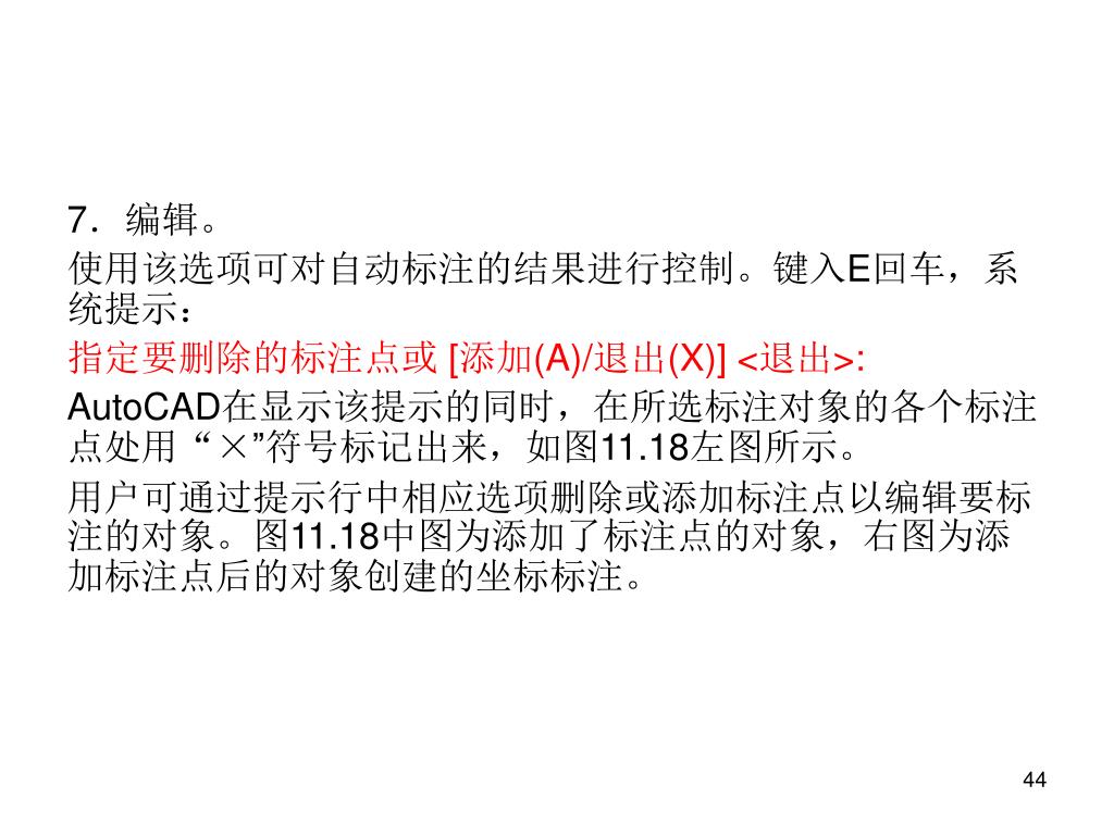 7.编辑。 使用该选项可对自动标注的结果进行控制。键入E回车,系统提示: 指定要删除的标注点或 [添加(A)/退出(X)] <退出>: AutoCAD在显示该提示的同时,在所选标注对象的各个标注点处用“×”符号标记出来,如图11.18左图所示。 用户可通过提示行中相应选项删除或添加标注点以编辑要标注的对象。图11.18中图为添加了标注点的对象,右图为添加标注点后的对象创建的坐标标注。
